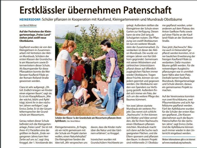 Die Kleingartenanlage “Freies Land e.V.” existiert seit nunmehr 76 Jahre und ist im Bezirksverband Weißensee die drittgrößte ihrer Art. Auf deren Fläche werden an verschiedenen Orten Apfel-, Kirsch- und Zwetschgenbäume ein neues Zuhause finden. Gepflanzt werden sie von ElternvertreterInnen und SchülerInnen der naheliegenden Grundschule am Wasserturm, welche die Patenschaft und Pflege der Bäume übernehmen.