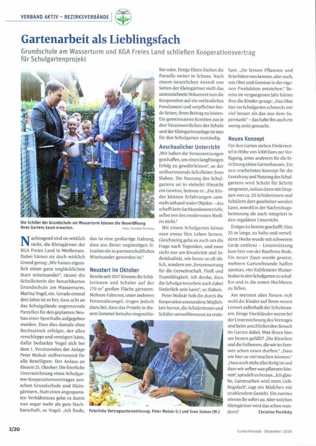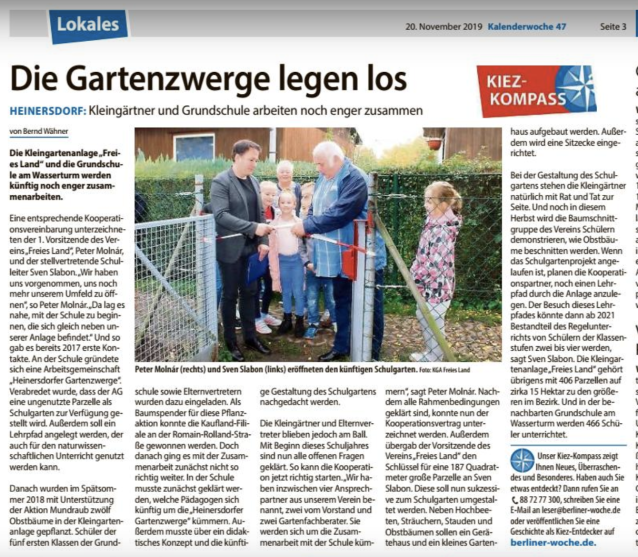 Die Kleingartenanlage “Freies Land e.V.” existiert seit nunmehr 76 Jahre und ist im Bezirksverband Weißensee die drittgrößte ihrer Art. Auf deren Fläche werden an verschiedenen Orten Apfel-, Kirsch- und Zwetschgenbäume ein neues Zuhause finden. Gepflanzt werden sie von ElternvertreterInnen und SchülerInnen der naheliegenden Grundschule am Wasserturm, welche die Patenschaft und Pflege der Bäume übernehmen.